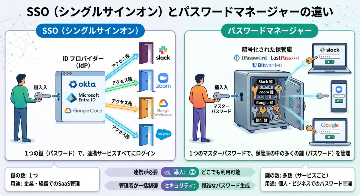 企業での利用: 会社が契約している主要なツール(SaaS)はSSOでまとめ、SSOに対応していないマイナーなサイトや管理ツールにはパスワードマネージャーを使うのがベストな運用です。
